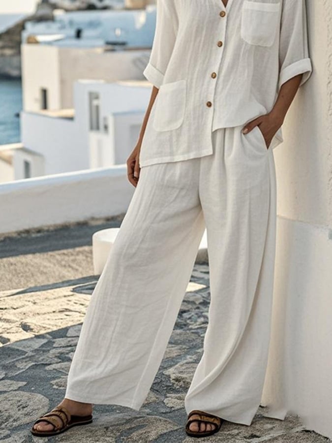 Women'S Solid Color V-Neck Button Cotton And Linen Two-Piece Set